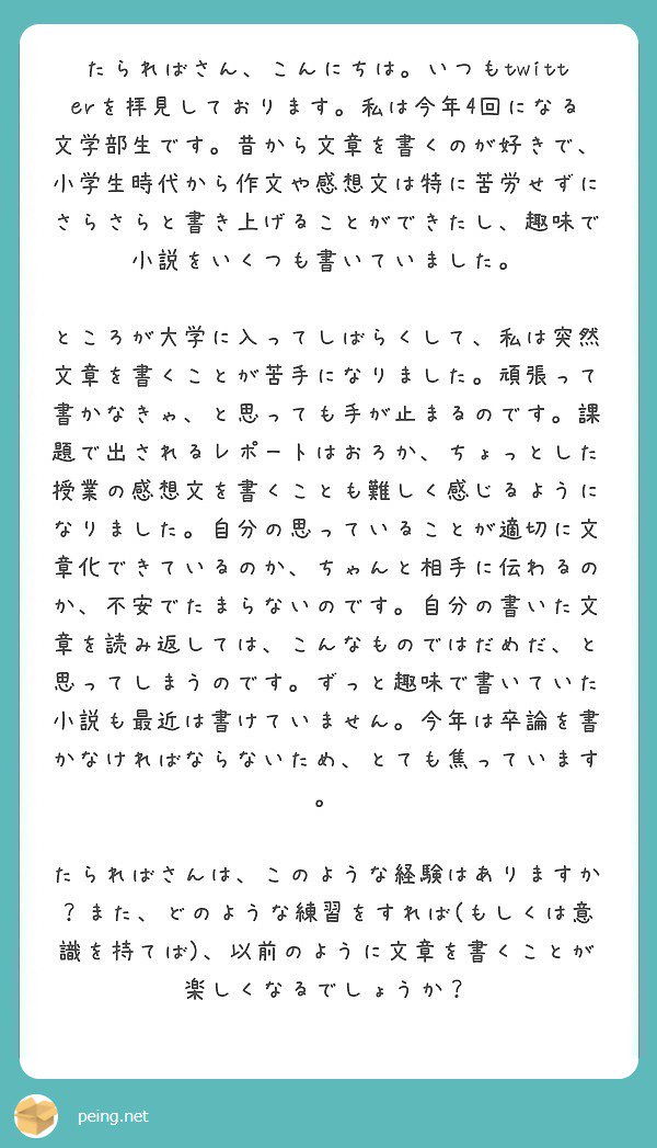 O Xrhsths たられば Sto Twitter 幼い頃から文章を書くのが好きだった 人が レポートや卒論 仕事の報告書を書く時に壁に当たるケースはよくあります 自由に書いてきた人が 様式 を身につける際の苦しみです 様式は様式として身につけましょう Peing 質問箱