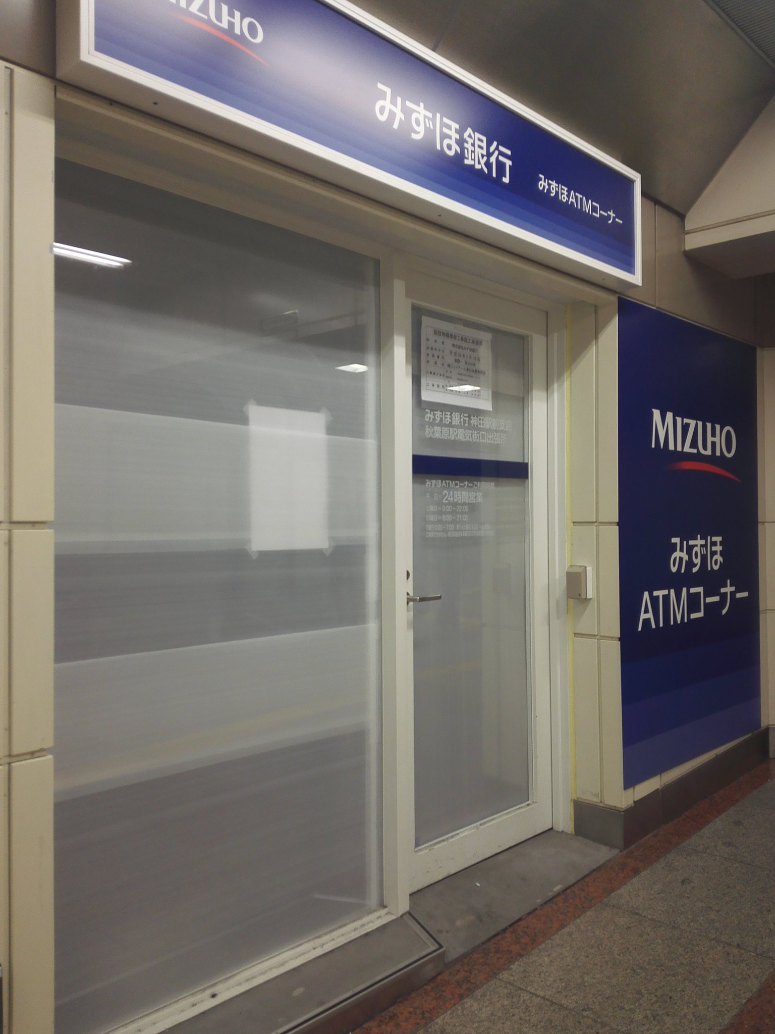 霧 No Twitter 昨日もツイートした東西自由通路 みずほ銀行atmコーナー 今日見たら扉に店名が貼られているんだけど みずほ銀行 神田駅前支店 秋葉原電気街口出張所 らしい 平日24時間 土曜は0 22時 日祝は8 21時が稼働時間とのこと Https T Co Geaivqr4qw