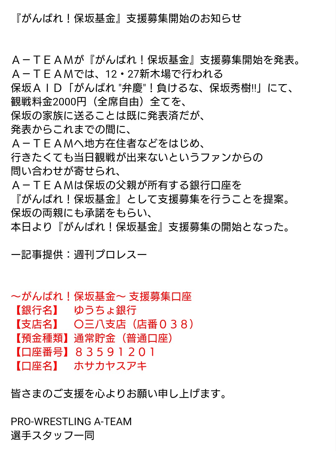Pro Wrestling A Team On Twitter がんばれ 保坂基金 支援募集開始のお知らせ Https T Co Mymbjwgrmh 保坂選手のお父様の銀行口座になります 銀行 ゆうちょ銀行 支店 三八支店 店番038 種類 普通口座 番号 83591201 名義 ホサカヤスアキ 皆さまの