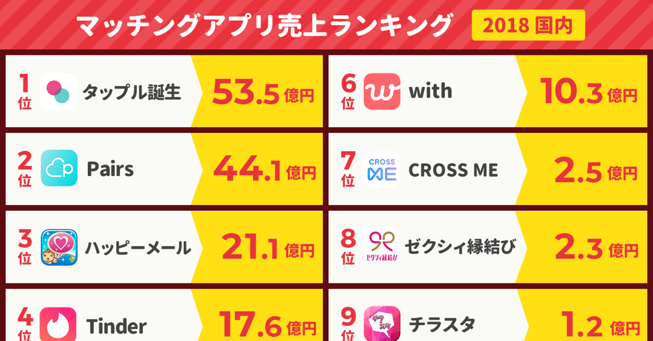 タップル 53億円 Pairs 44億円 マッチングアプリ売上ランキング2018 国内 アプリマーケティング研究所 Note ニュートピ Twitterで話題のニュースをお届け